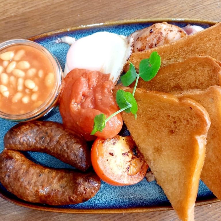 A butcher's sausage (Lancaster's), slice of bacon, egg, beans or tomatoes, hashbrown and toast. Add a barista coffee for just £2.