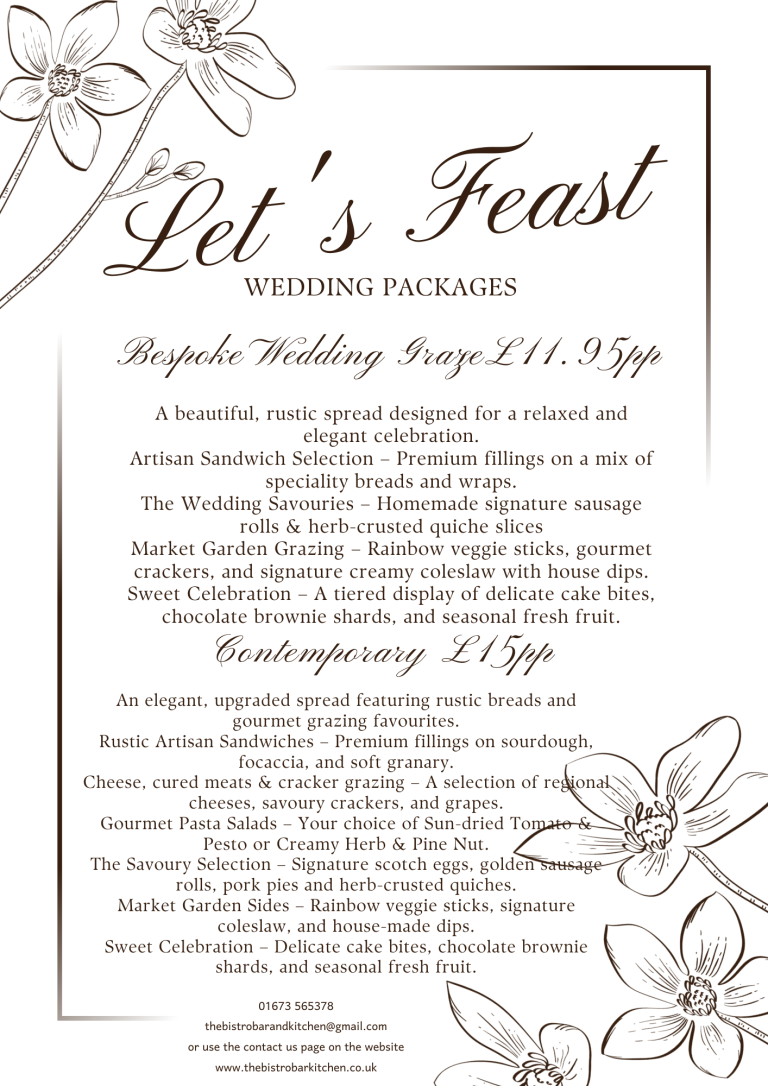 Our buffets can be tailored and adapted to suit your needs. Whether you are enjoying a buffet at the Bistro or at a venuw of your choice we are sure to have the package to suit your needs. Delivery may be available. We also cater for dietary needs.