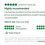 A huge thank you to Vivien H for sharing such a lovely review on TripAdvisor recently. Vivien visited us twice in February and had some wonderful things to say about our food, our "sensible prices," and—most importantly—our hardworking team!